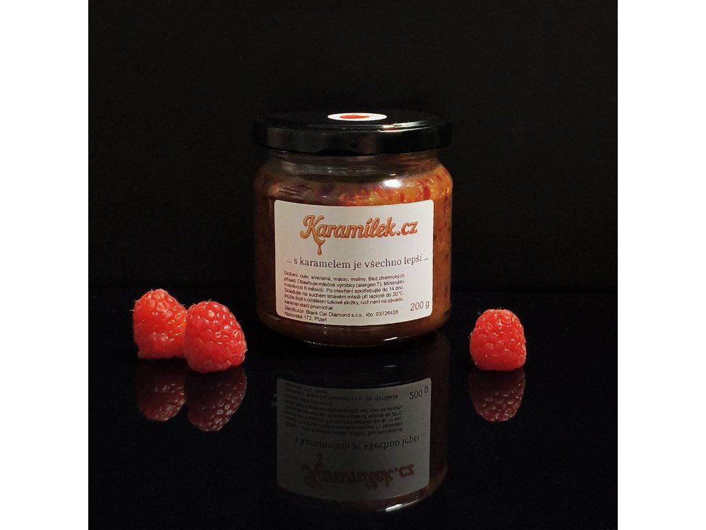 Smetanový karamel složený z cukru, másla, 35% smetany, maliny. Žádné chemické přísady ani dochucovadla.