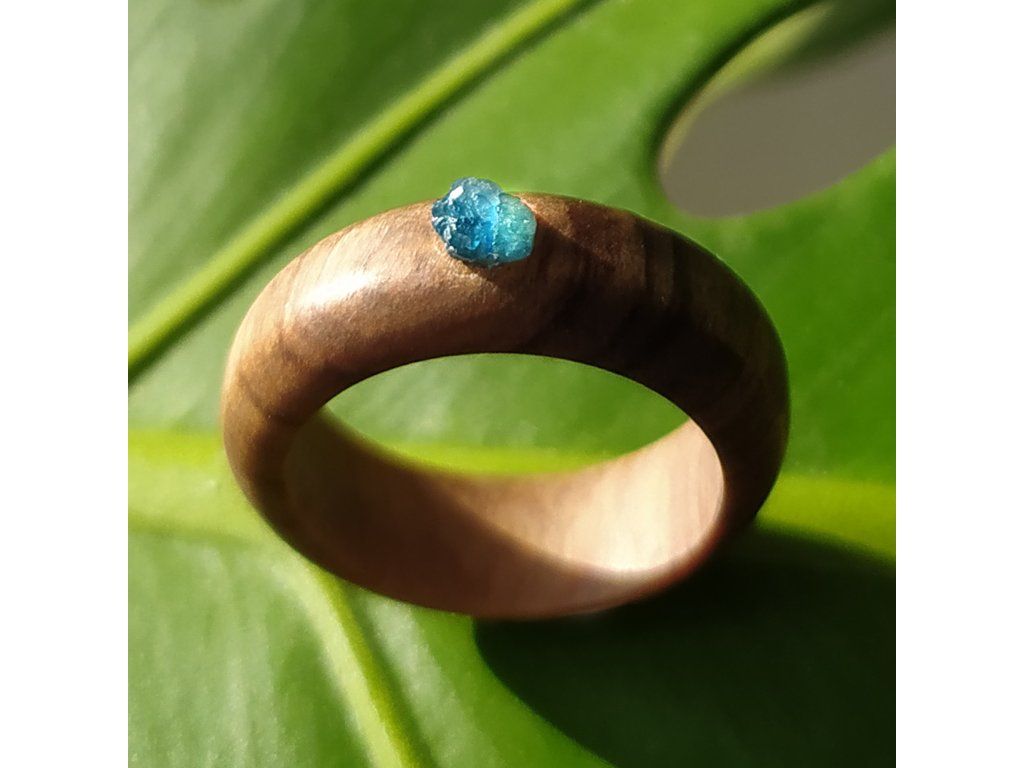 Prsten z olivového dřeva s nádhernou kresbou osazen nebroušeným modrým diamantem velikost 53